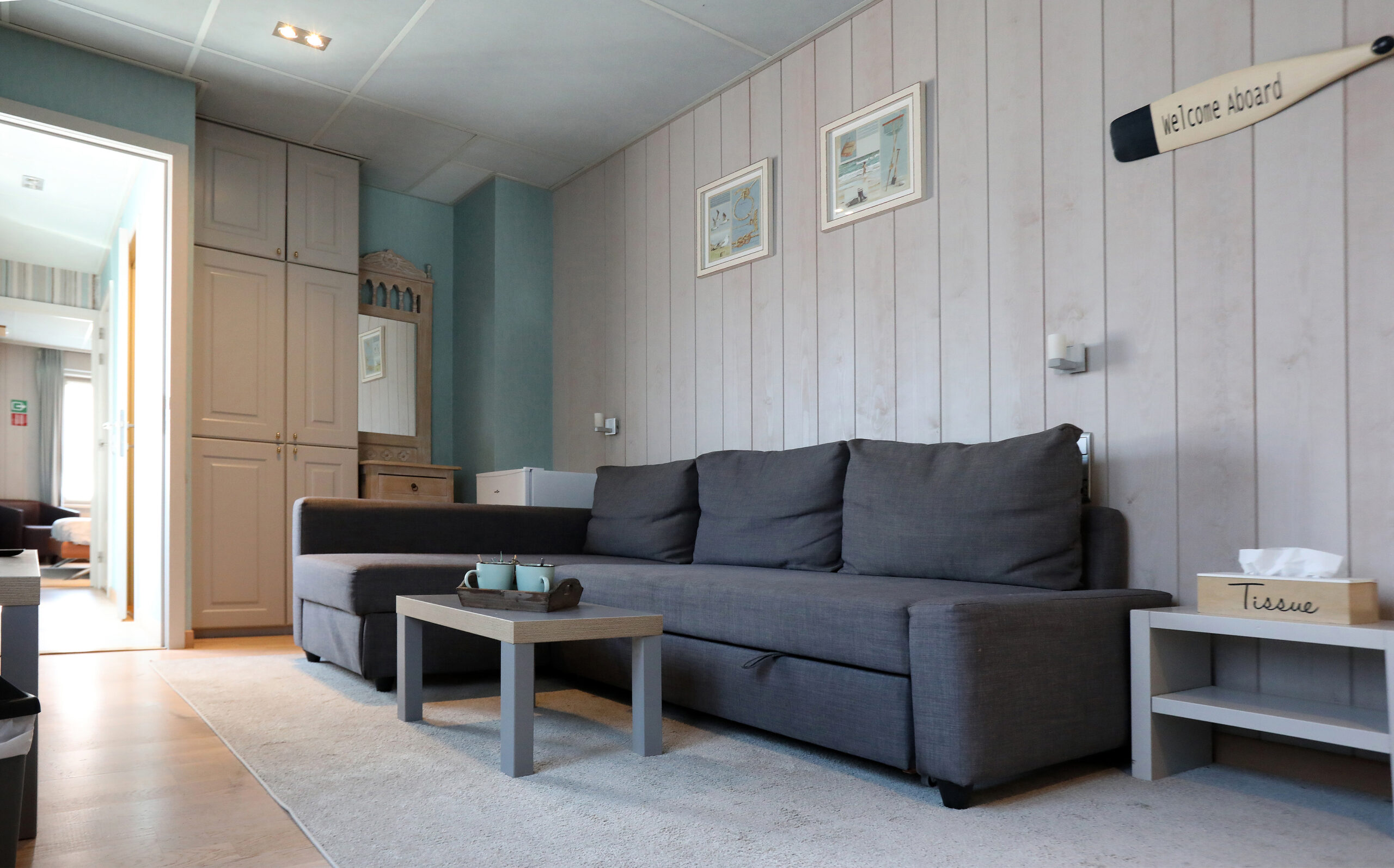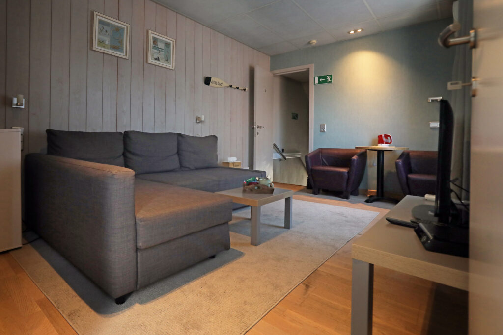 Dit is een familiekamer met een tweepersoonsbed en een slaapbank.